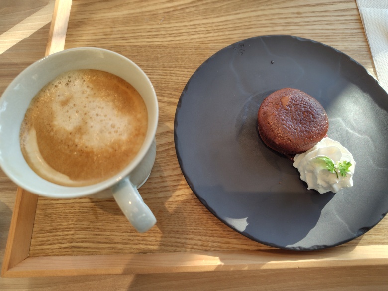 外が暖かかったので,近くの有料老人ホームに併設されるカフェまで歩いていき,飲み物とデザートを頼んだ。