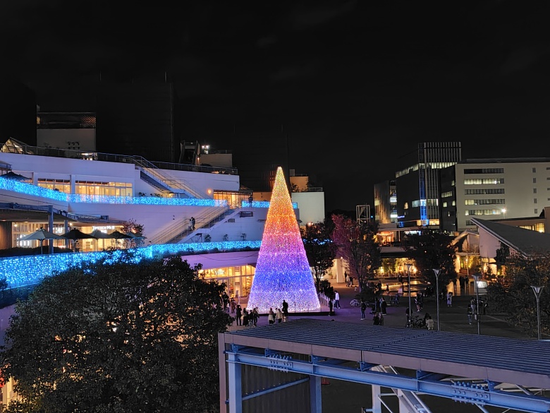 ついでに,前回は生憎の雨で余りよく見ることができなかったイルミネーションを,よりよく見える場所から。(どうも色合いが刻々と変化するらしい。)
