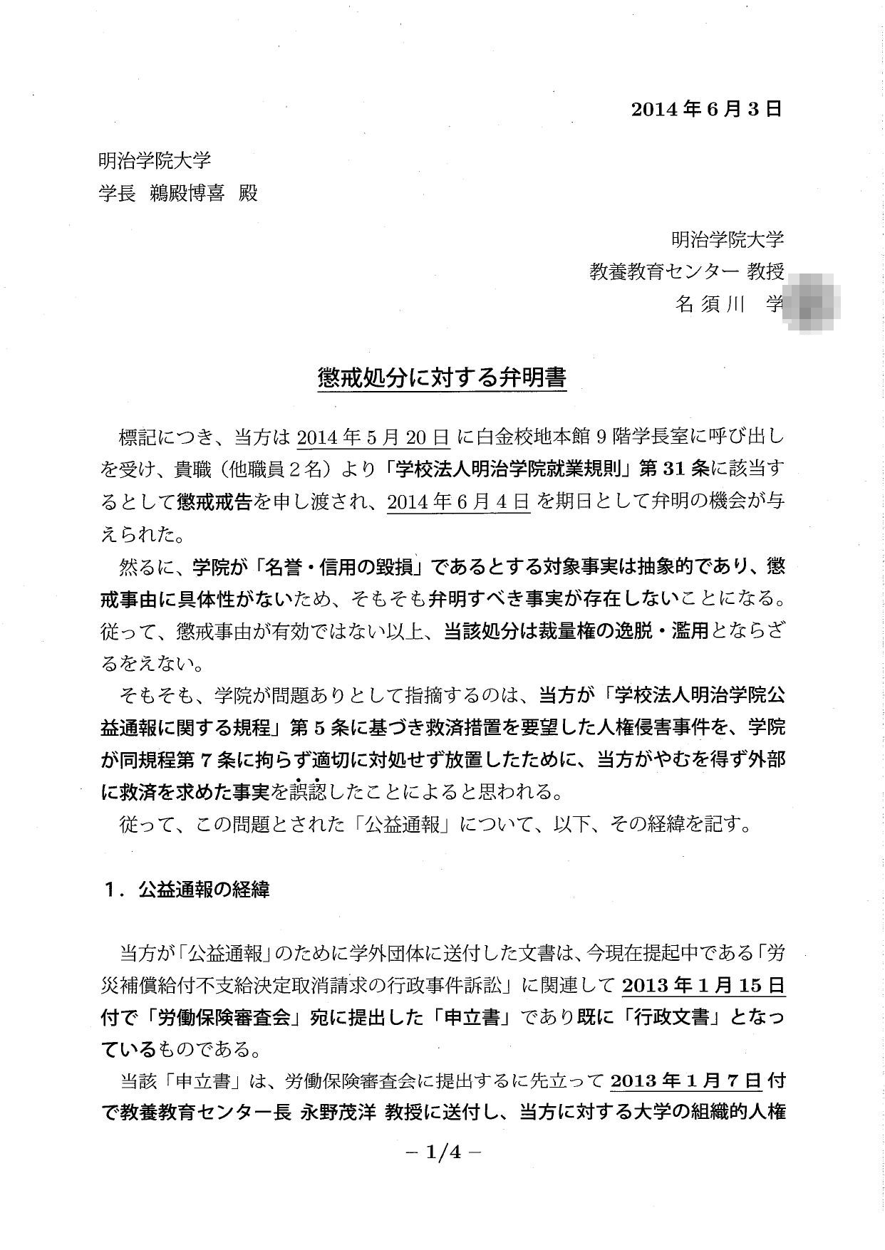 次が,2014年6月3日付鵜殿博喜学長宛「弁明書」である。